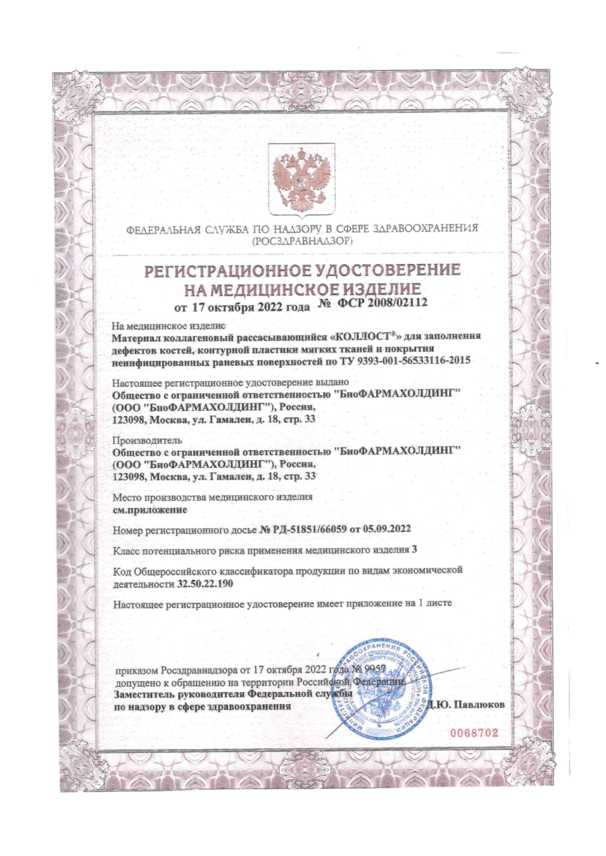 Материал коллагеновый рассасывающийся "КОЛЛОСТ"-гель 7%, 0,1 см3